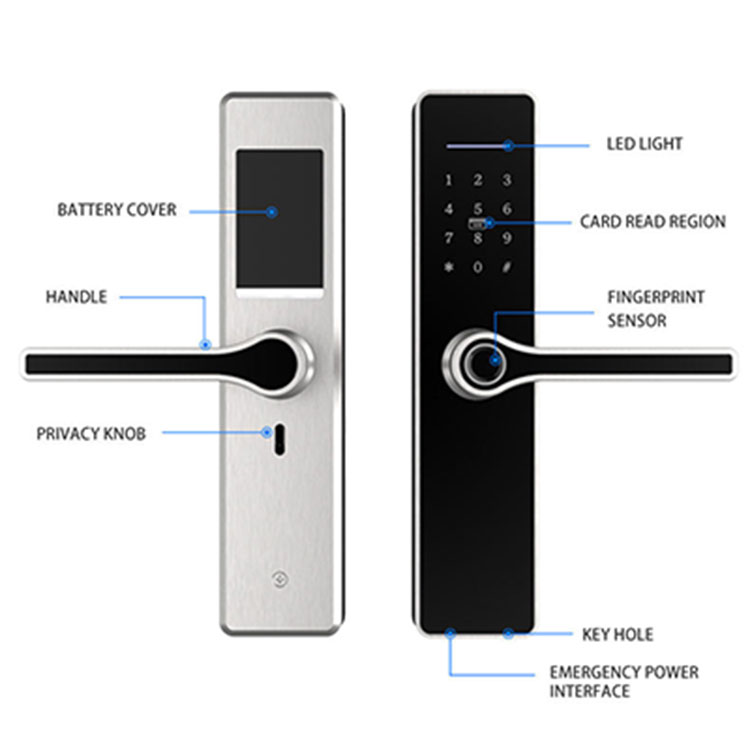 1. Tillgång via app/fingeravtryck/kod/kort/mekanisk nyckel.2. Hög känslighet för pekskärm Digital Board.3. Kompatibel med TT Lock eller Tuya -app.